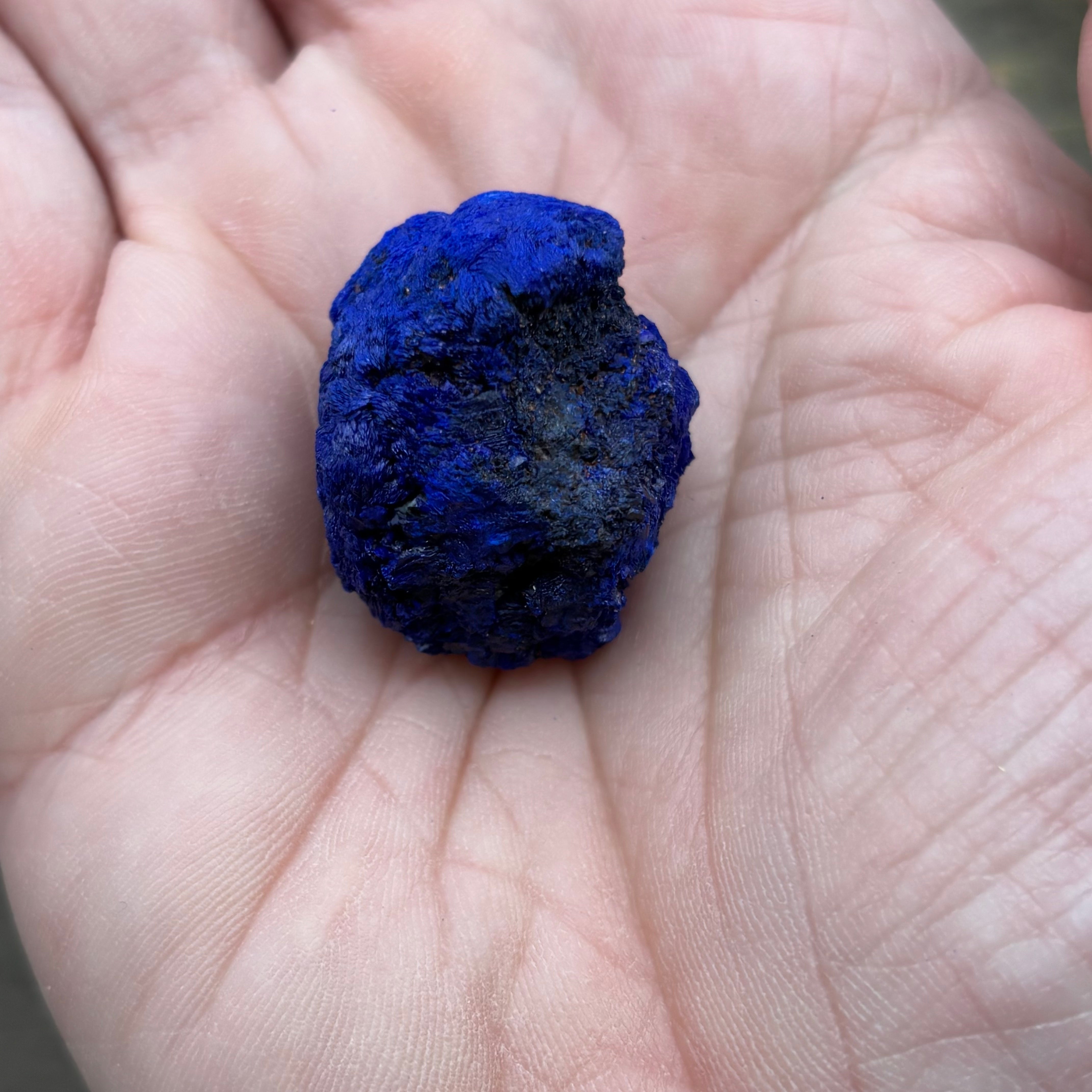 We have a very limited new collection of Siberian Azurite concretions. These are breathtaking in their blue color and have formed in the tundra as geological concretions. They are bursting with clear qi and richness. These are sometimes cut in half to reveal geodes of small Azurite crystals inside, but these ones have not been cut. The color is absolutely stunning and the size is very practical and can adapt to many different healing uses.