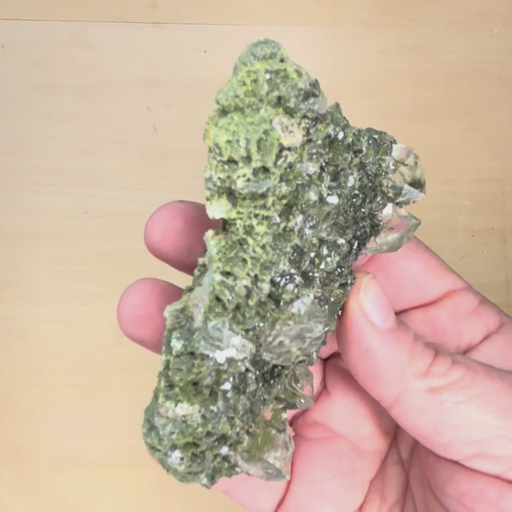 The name epidote means “to increase”. Think of it for staying power through an illness, deep and lasting recovery, augmentation of vitality and healing on every level. Epidote is perfect for weakness caused by complex situations like tangled co-infections, re-emerging illnesses, compromised immunity and hormonal repair. When things feel like they have become hopelessly complex and draining, like multiple body systems are involved, epidote is your go to healing mineral. In this deposit, the quartz is brilliantly amplifying the epidote, clearly powering it up to engage with the world even more. These are pure life!